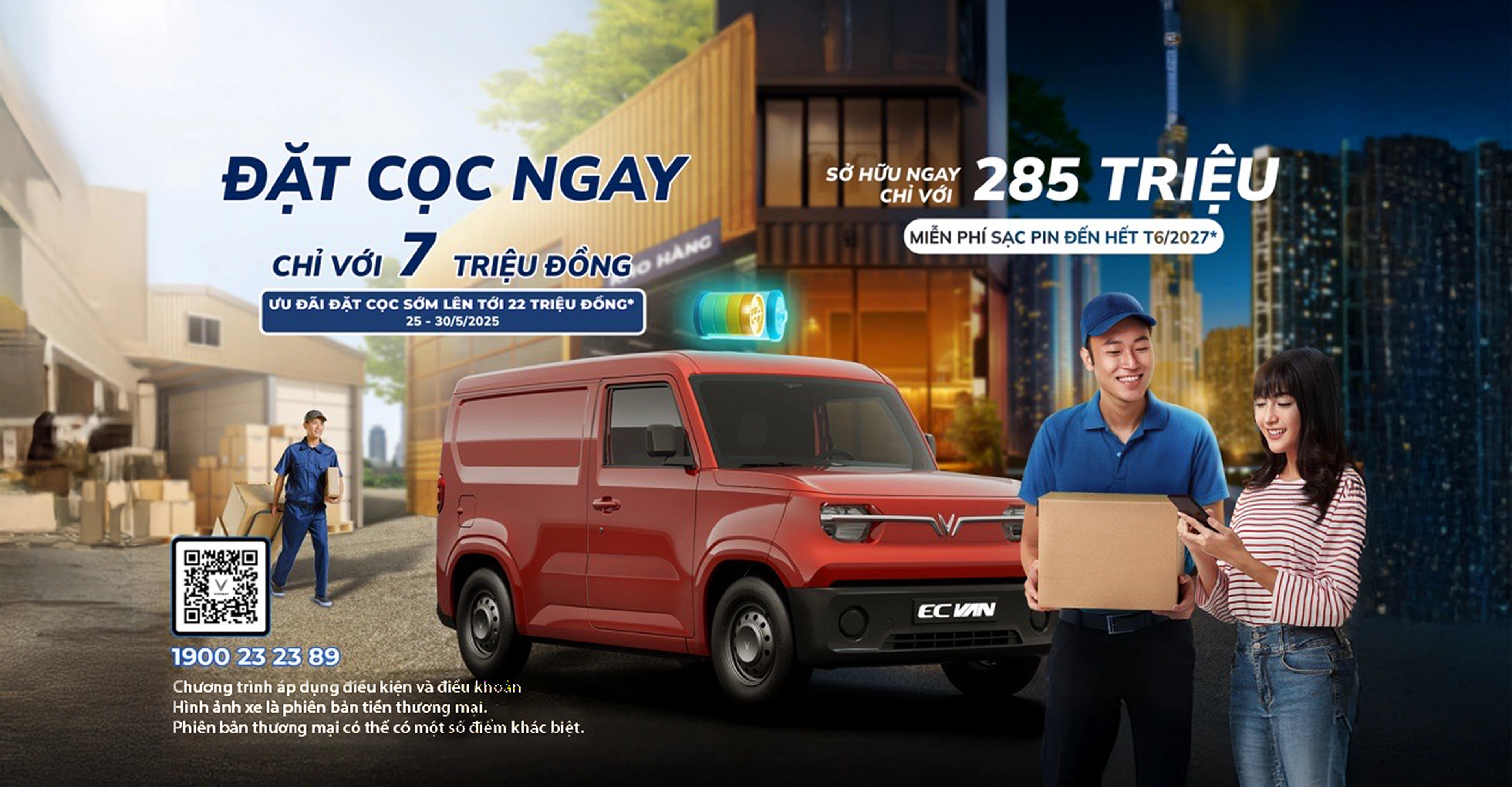 Từ 08h00 ngày 25/05/2025 đến hết ngày 30/05/2025, VinFast sẽ chính thức triển khai chương trình nhận cọc sớm mẫu xe điện chở hàng EC Van tại hệ thống đại lý VinFast Long Biên và website chính hãng, hoặc hệ thống của đối tác Xanh SM. Tất cả khách hàng đặt cọc trong thời gian này sẽ nhận được ưu đãi 10 triệu đồng, trừ trực tiếp vào giá xe.